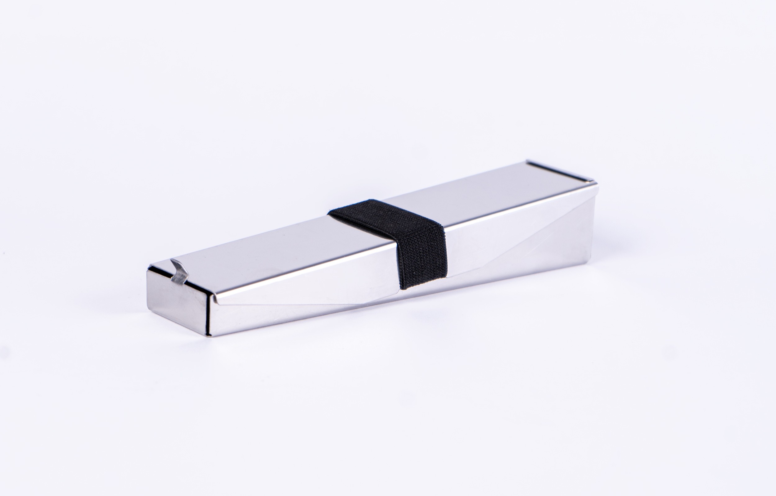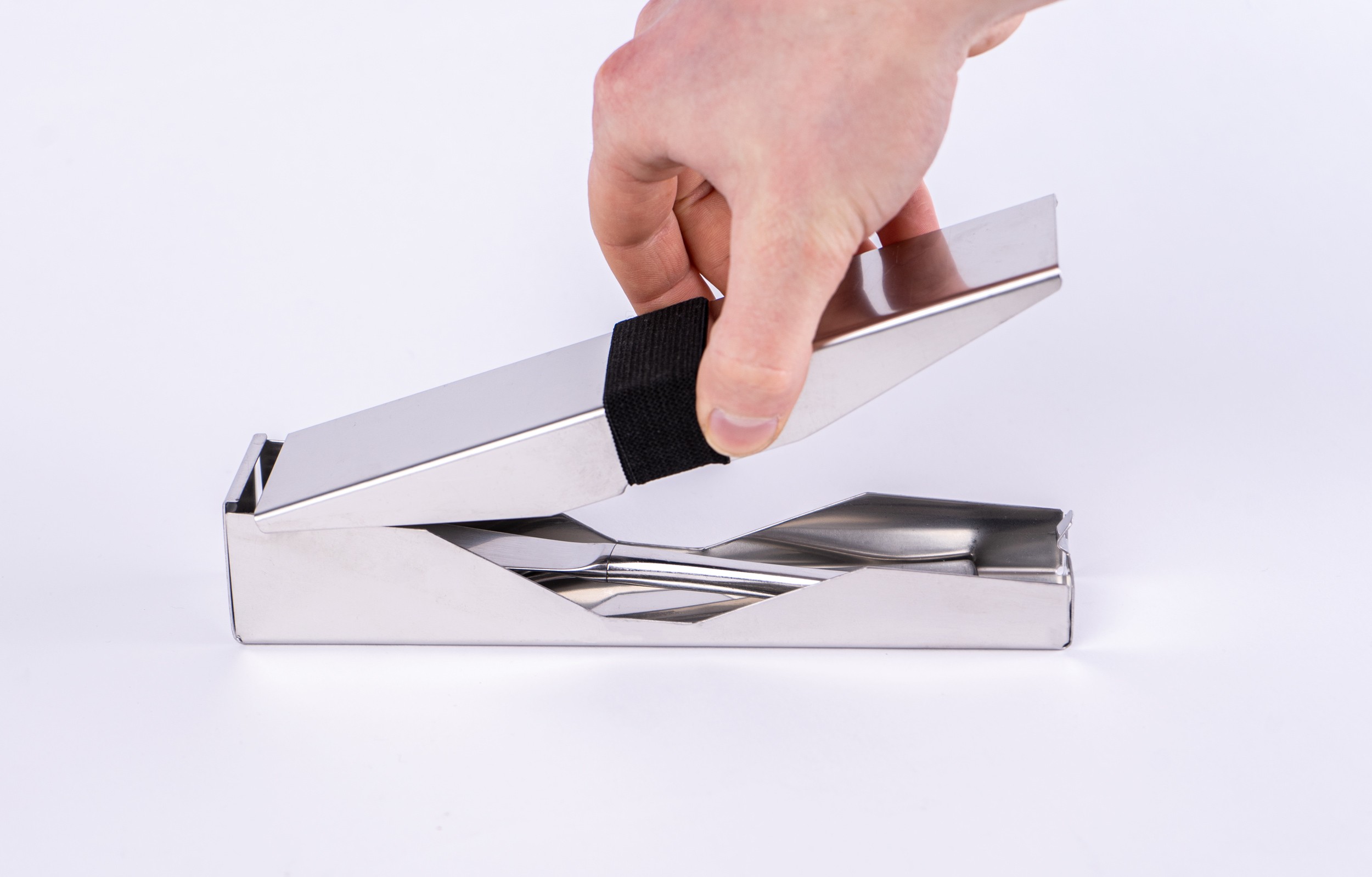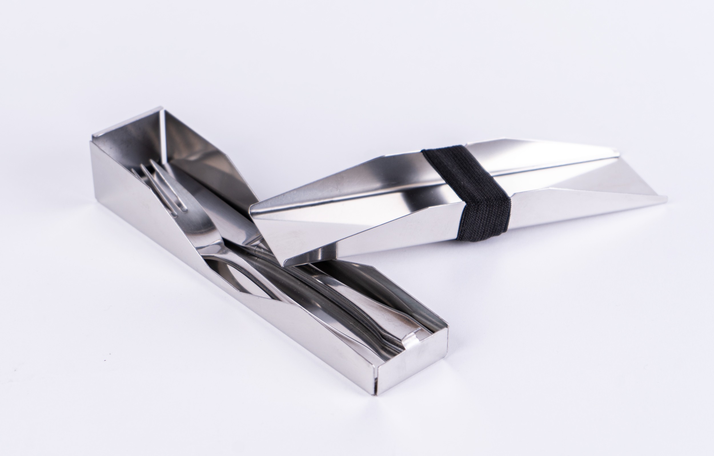 SilentDine is a portable cutlery storage case crafted from stainless steel. It features an integrated elastic band in the lid that secures the cutlery upon closing, preventing shifting and eliminating rattling noises while on the move.