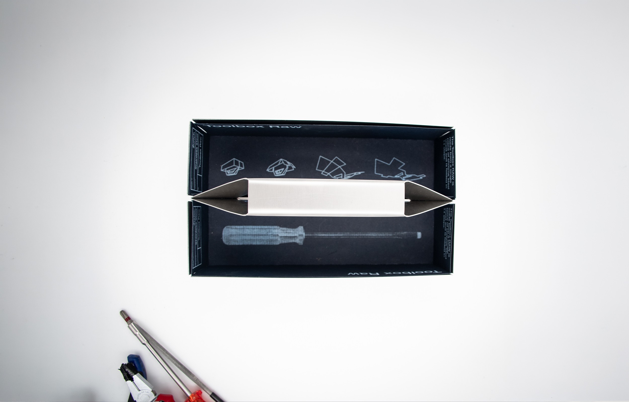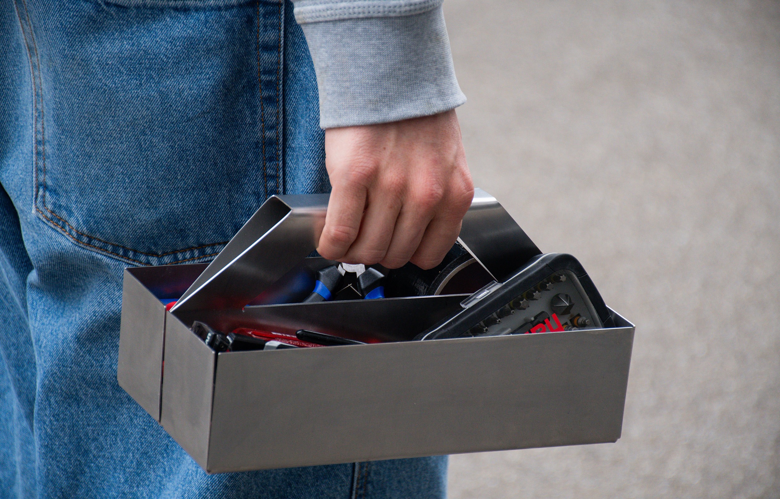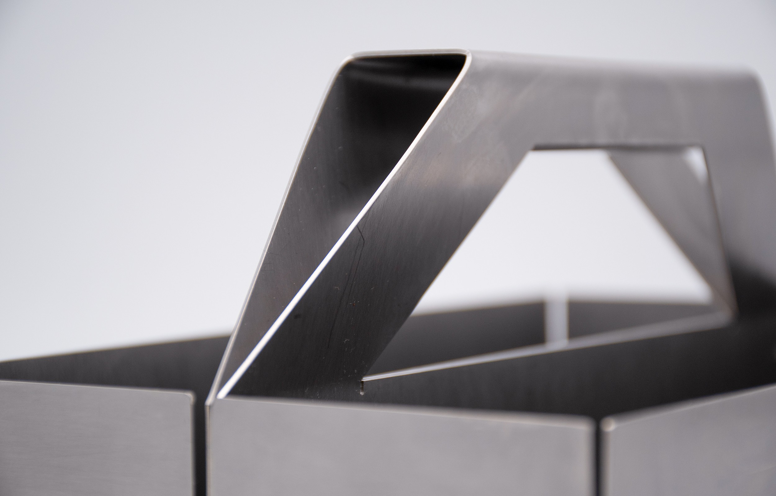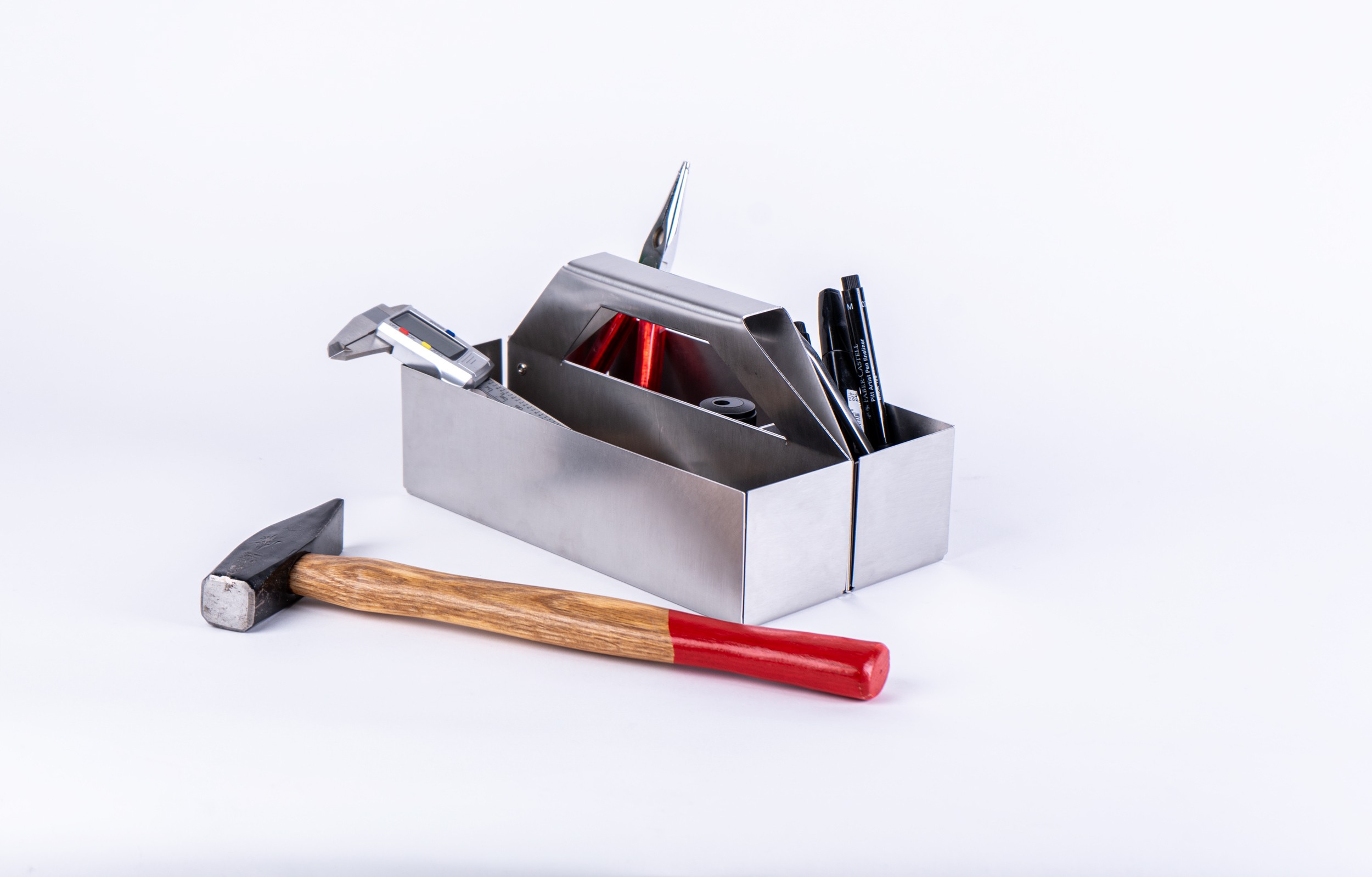 Toolbox RAW is crafted from a single sheet of raw stainless steel, defined by its clear and minimalist form. The core design challenge was to create an object exclusively from a single flat pattern, which guided the entire development process.