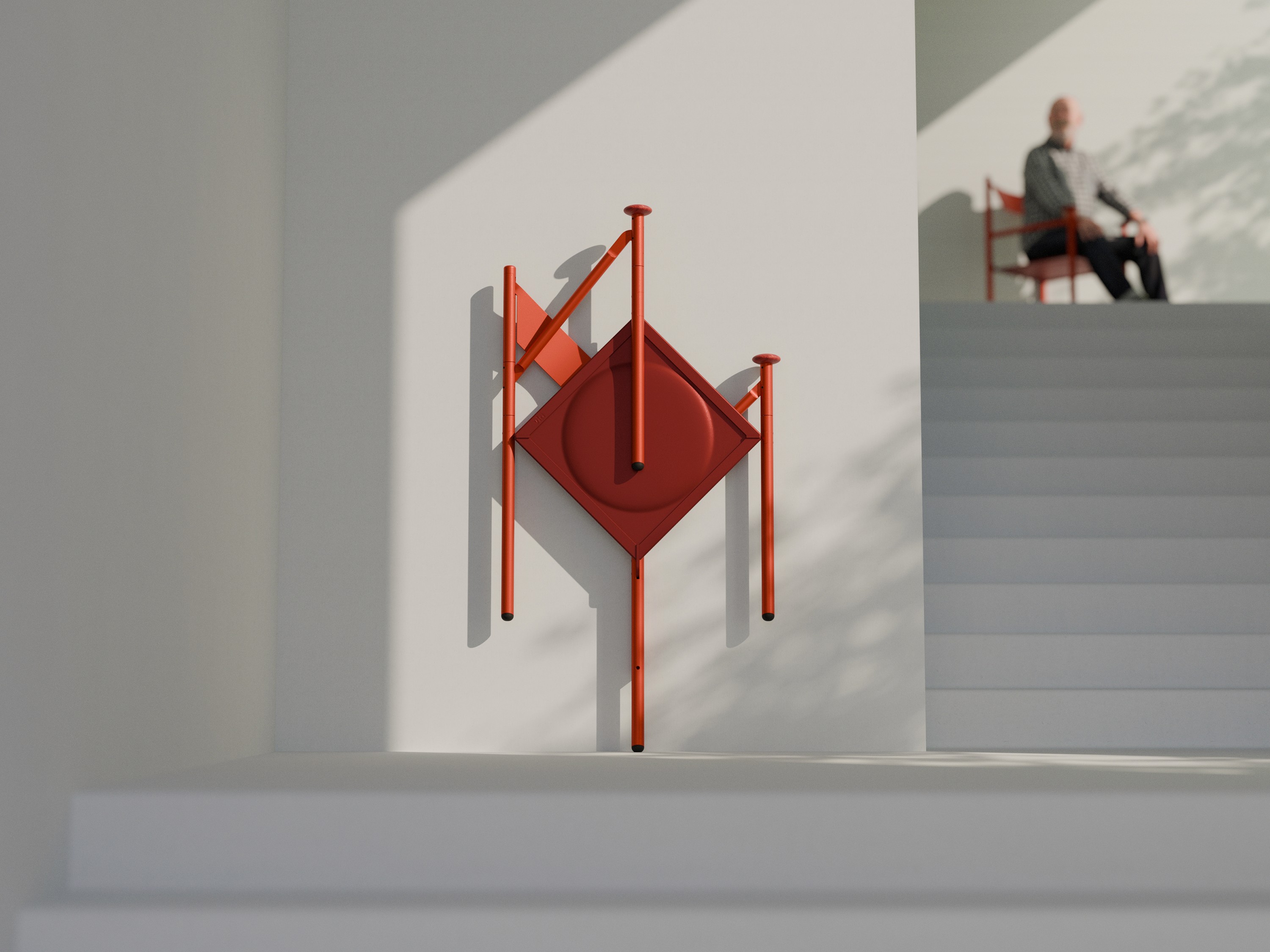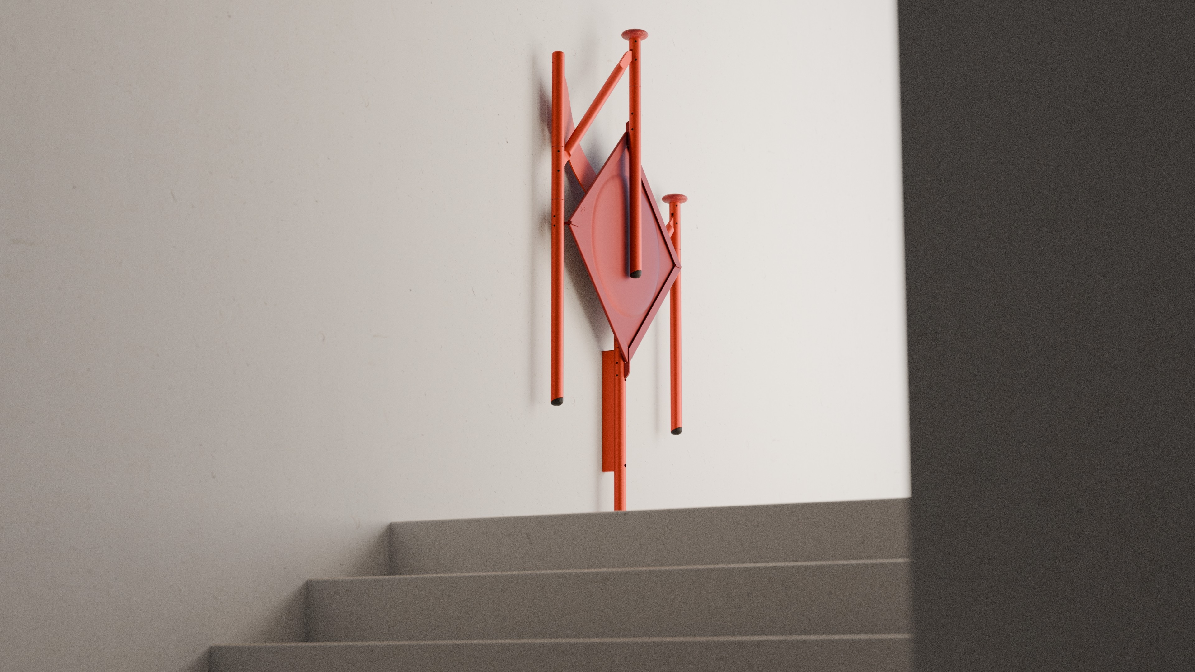 «via» is a wall-mounted folding chair for stairwells that divides the climb into manageable stages for elderly people, providing the security needed to continue using stairs as an active form of daily exercise. The design, crafted from powder-coated aluminum and oak, intentionally breaks with the aesthetics of conventional assistive devices, while an integrated gas spring ensures that escape routes are automatically kept clear. By positioning the chairs on landings, the anonymous stairwell is reactivated into a social meeting zone that promotes mobility and independence in old age.